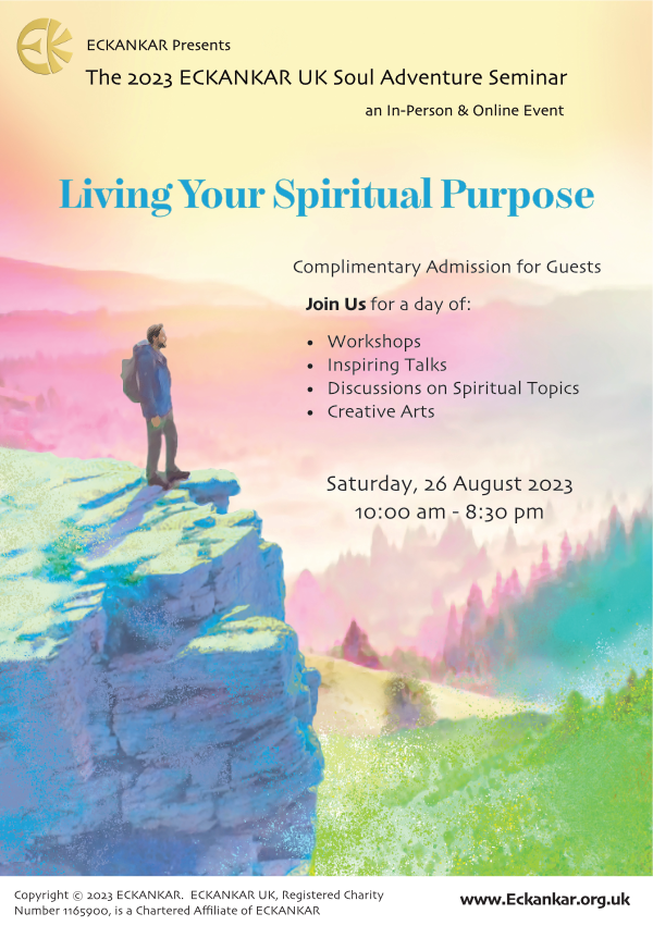 The 2023 ECKANKAR UK Soul Adventure Seminar Looking for spiritual community? Dive deep with others of like heart at an ECK seminar, and take life to another spiritual level. WHEN26 August 2023 PROGRAMMEMorning: 10:00am-12:00pmAfternoon: 2:00pm-5:00pmEvening: 7:00pm-8:30pm WHERETrowbridge Civic Centre, Wiltshire Venue Information HOW TO GET THEREThe Civic Centre is easily accessible by public transport and is located a 10-minute walk from Trowbridge Train Station and a short walk from nearby bus stops. Directions Google Map ACCOMMODATIONThere is a variety of accommodation within easy reach of the seminar. More information is available in the link below. Accommodation NEW TO ECK? BE OUR GUEST!This seminar can help you move forward spiritually as a divine light of God that shines with the certainty of life! Whatever your faith or background, come and discover more about your divine nature as Soul! The 2023 ECKANKAR UK Soul Adventure Seminar You are cordially invited to attend the seminar as our guest either in person or online (via Zoom). In Person Online Visit our “Guest Welcome” desk next to Registration in the foyer at the Civic Trowbridge for your name badge, programme, and guest welcome pack!
